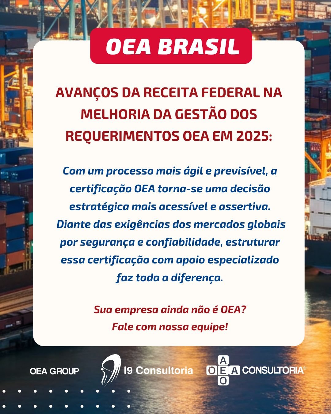 Somos especialistas na Certificação OEA (Operador Econômico Autorizado), oferecendo serviços de consultoria, auditoria e treinamentos de excelência para facilitar a obtenção e manutenção do status de Operador Econômico Autorizado (OEA | AEO) em diversos países.