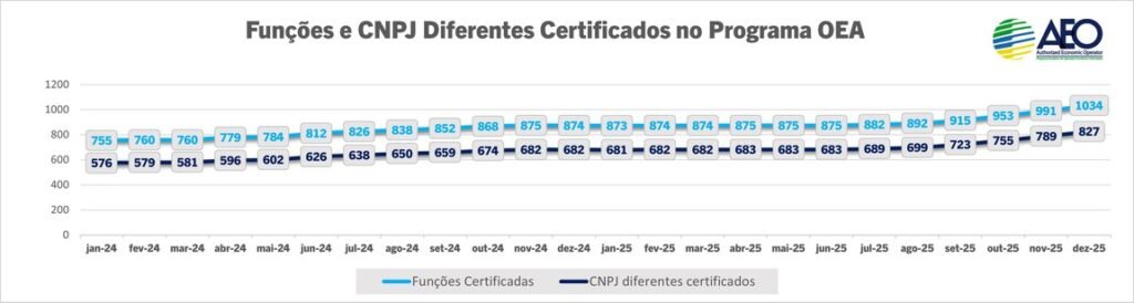 🔹 O número de funções certificadas OEA cresceu de 755 para 1.034, um incremento de 279 certificações em 24 meses.