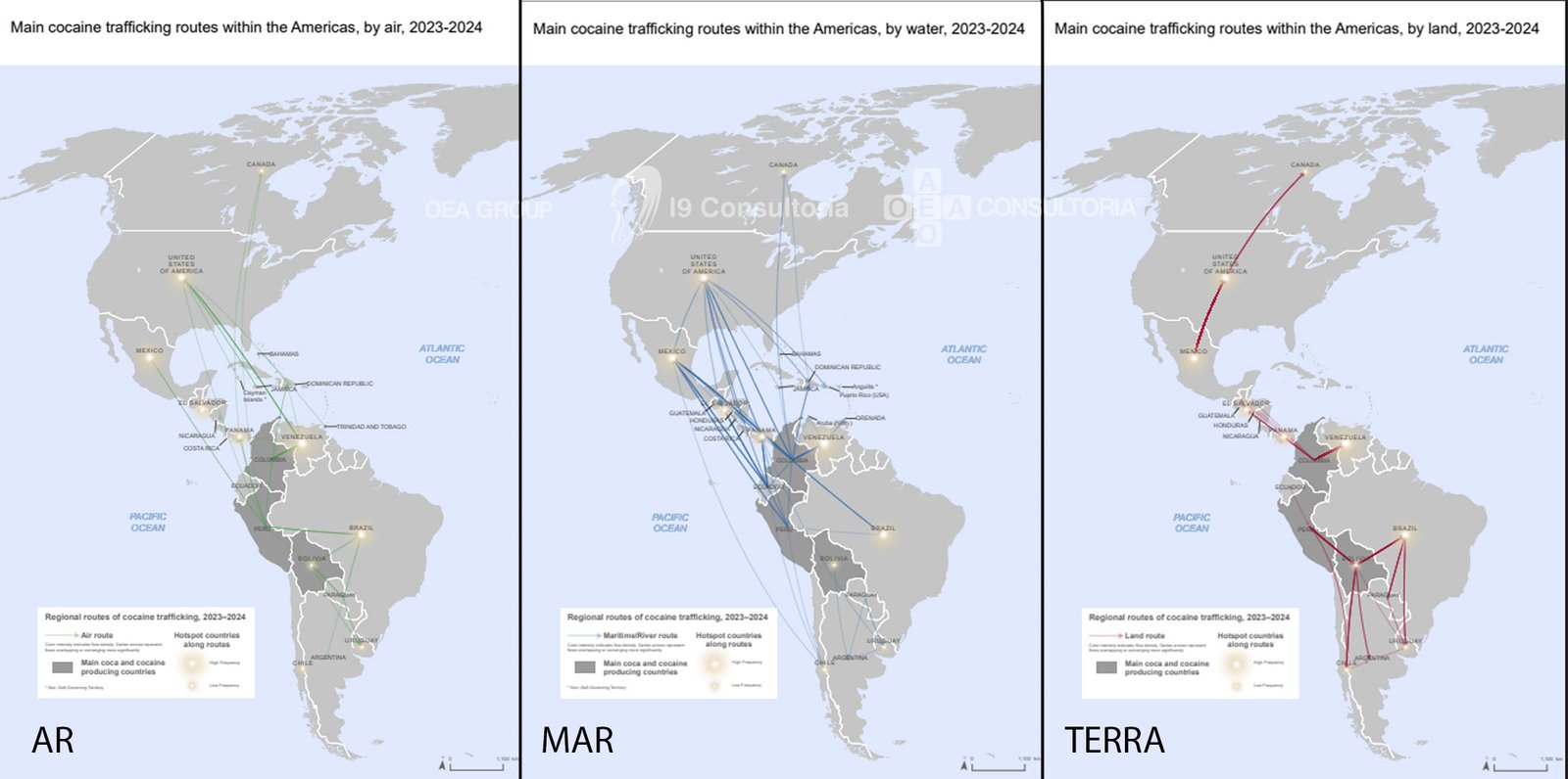 Os mapas a seguir trazem uma visão detalhada dessas rotas multimodais, mostrando como o tráfico se espalha pelo continente e quais pontos demandam atenção redobrada em uma gestão de riscos eficaz. Ao integrar essas informações à estratégia OEA, sua empresa consegue prevenir vulnerabilidades e fortalecer a segurança logística, transformando dados globais em decisões práticas e seguras.