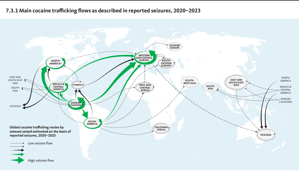 Figura 1: Principais fluxos de tráfico de cocaína conforme descrito nas apreensões reportadas, 2020–2023. Fonte: UNODC – World Drug Report 2025.